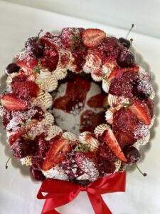 Available in 2 flavours (choose from the list below). Both Wreath flavours made up of bite sized chocolate brownie or caramel tan square, topped with chocolate sauce drizzle then finished off with piped torched Italian meringue, strawberry compote, fresh berries, freeze dried raspberries and icing sugar dusting with a beautiful red ribbon bow.
