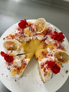 A silky smooth, melt in the mouth lemon tart base topped with torched Italian meringue and finished off with lemon curd, freeze dried raspberries and a pretty ref ribbon bow.