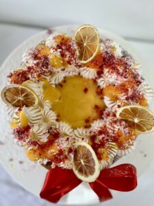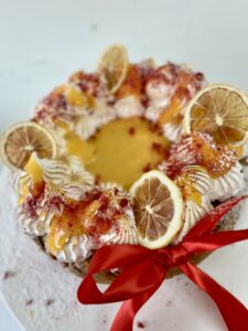 A silky smooth, melt in the mouth lemon tart base topped with torched Italian meringue and finished off with lemon curd, freeze dried raspberries and a pretty ref ribbon bow.