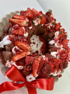 Your choice of slice flavour from the below list, served in bite sized pieces arranged in a delicious wreath. Topped with raw chocolate mousse, coconut yogurt, cacao sauce drizzle, strawberry compote, fresh strawberries and freeze dried raspberries and finished off with a beautiful red bow ribbon.