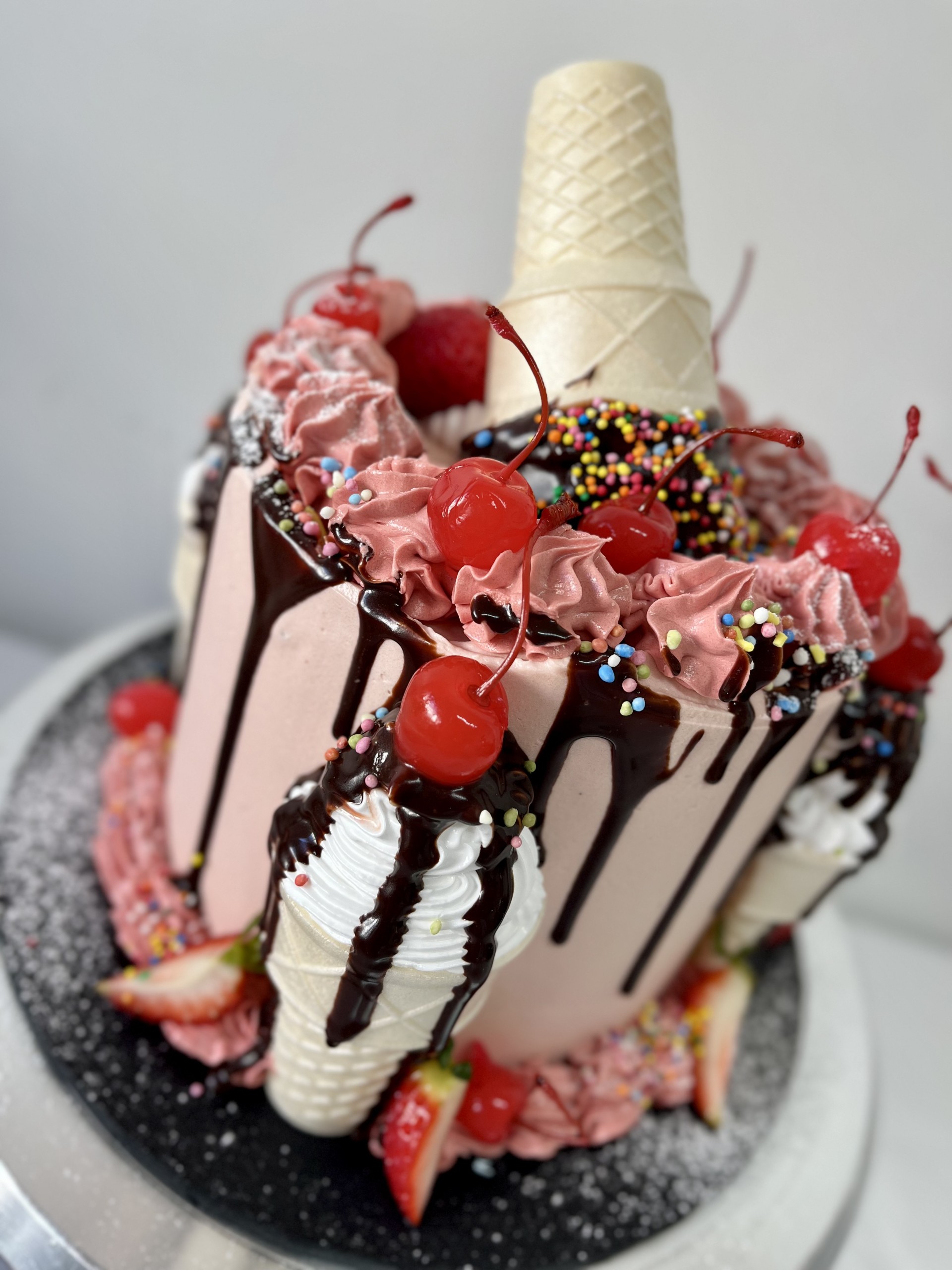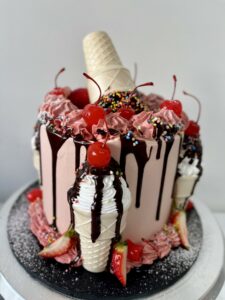 Our cute Ice Cream Cone themed cake with glace cherries, sprinkles and Italian meringue to finish it off!