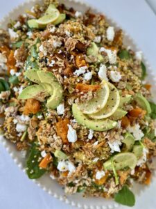 -Golden Roast Kumara and Quinoa Salad with toasted almonds, avocado, feta and golden tahini sauce (contains dairy)