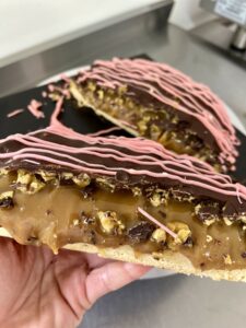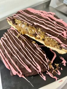 We’ve put our spin on it, made with a vanilla shortcake base, topped with a veeeeerrrry thick caramel then covered in housemade hokey pokey. Finished off covered in chocolate then more chocolate drizzled on top.